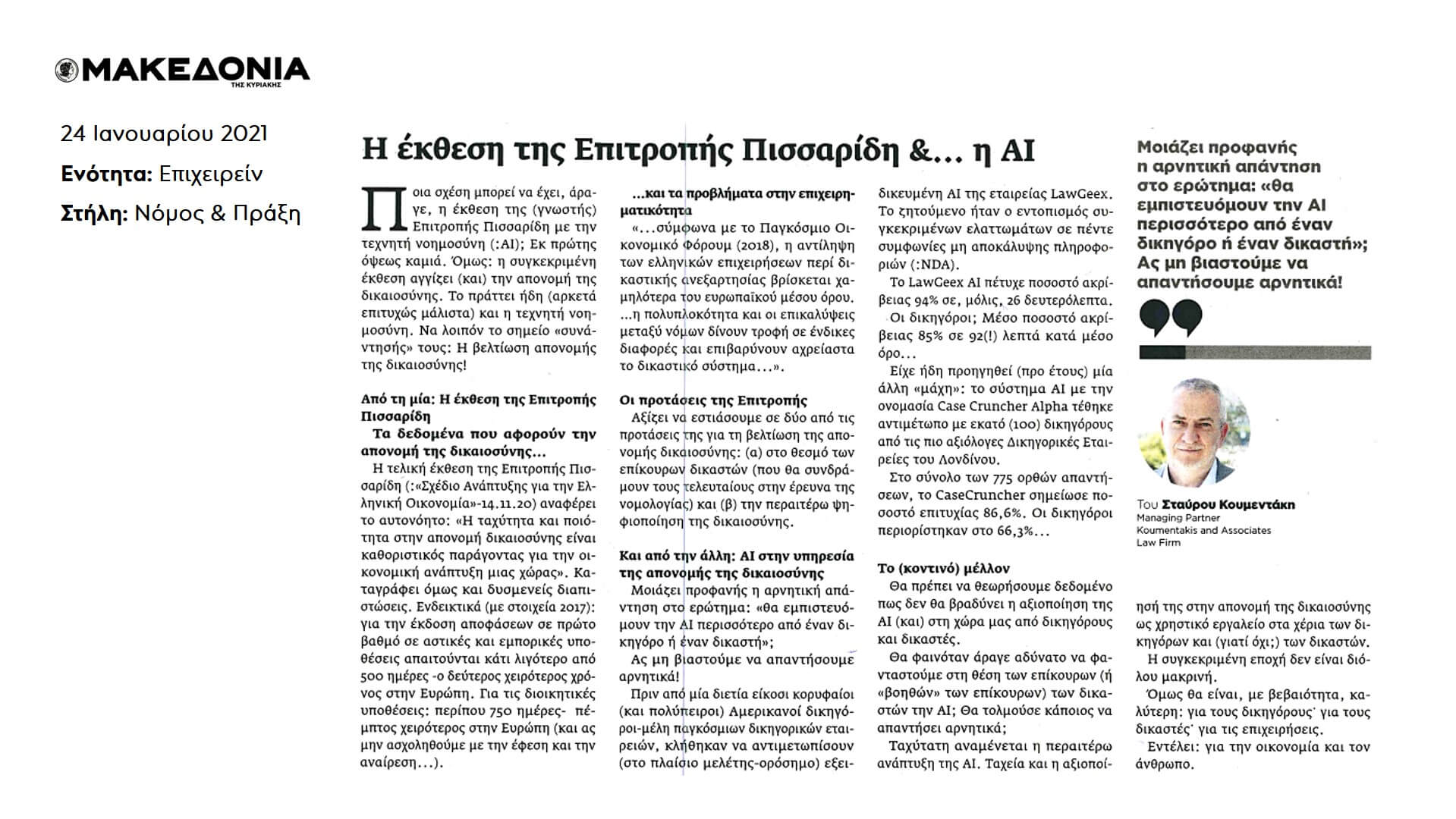 Η βελτίωση της ταχύτητας και ποιότητας στην απονομή της δικαιοσύνης θα αποτελέσει (και κατά την έκθεση Πισσαρίδη) καθοριστικό παράγοντα για την οικονομική ανάκαμψη και ανάπτυξη της χώρας μας.
