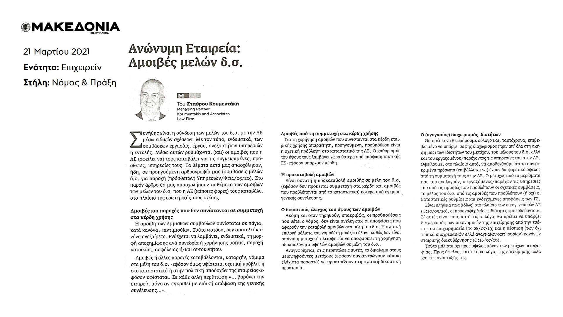 Το Διοικητικό Συμβούλιο της Ανώνυμης Εταιρείας ενεργεί, κατ’ αρχήν, συλλογικά. Είναι όμως δυνατή (:κανόνας, μάλλον, ανεξαίρετος) η εκχώρηση εξουσιών δέσμευσης και εκπροσώπησης σε συγκεκριμένο/α μέλη του. Συνήθης επίσης είναι η σύνδεση των μελών του ΔΣ με την ΑΕ μέσω ειδικών σχέσεων. Με τον τύπο, ενδεικτικά, των συμβάσεων εργασίας, έργου, ανεξαρτήτων υπηρεσιών ή εντολής. Μέσω αυτών ρυθμίζονται (και) οι αμοιβές που η ΑΕ (οφείλει να) τους καταβάλει για τις συγκεκριμένες, πρόσθετες, υπηρεσίες τους. Τα θέματα αυτά μας απασχόλησαν, ήδη, σε προηγούμενη αρθρογραφία μας [:Συμβάσεις Μελών ΔΣ για Παροχή (Πρόσθετων) Υπηρεσιών]. Στο παρόν άρθρο θα μας απασχολήσουν τα θέματα των αμοιβών των μελών του ΔΣ που η ΑΕ (κάποιες φορές) τους καταβάλει στο πλαίσιο της εσωτερικής τους σχέσης. Στην τελευταία αυτή περίπτωση, η νομική βάση της καταβολής των αμοιβών πρέπει να αναζητηθεί στο καταστατικό, σε απόφαση της ΓΣ ή στην πολιτική αποδοχών που, ενδεχομένως, υιοθετεί η ΑΕ (:υποχρεωτικά εφόσον είναι εισηγμένη).