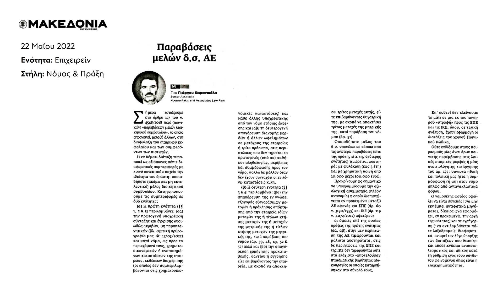 Σήμερα εστιάζουμε στο άρθρο 177 του ν. 4548/2018 περί (ποινικών) «παραβάσεων μελών διοικητικού συμβουλίου», το οποίο αποσκοπεί, μεταξύ άλλων, στη διαφύλαξη του εταιρικού κεφαλαίου και των συμφερόντων των πιστωτών.