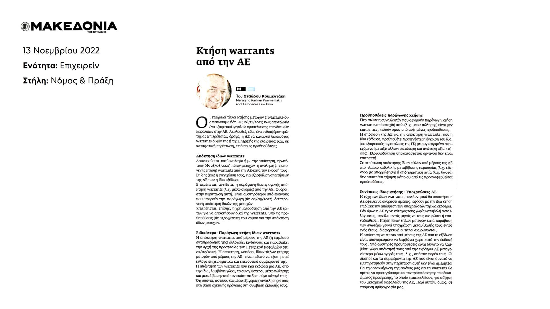 Διαπιστώσαμε ήδη, στο πλαίσιο προηγούμενης αρθρογραφίας μας, πως η κτήση warrants (:τίτλοι κτήσης μετοχών) συνιστούν ένα εξαιρετικό επενδυτικό εργαλείο. Η αξιοποίησή τους, όμως, απαιτεί ιδιαίτερη προσοχή. Η απόκτησή τους, λ.χ., από μέρους της ΑΕ που τα εξέδωσε είναι απαγορευμένο να λαμβάνει χώρα κατά την έκδοσή τους. Αντίθετα, και υπό αυστηρές προϋποθέσεις είναι δυνατό να λαμβάνει χώρα απόκτησή τους από την εκδότρια ΑΕ, σε επόμενη της έκδοσής τους χρονική στιγμή-μέσω αγοράς τους, λ.χ., από τον φορέα τους. Οι σκοποί και τα συμφέροντα της ΑΕ που είναι δυνατό να εξυπηρετηθούν στην περίπτωση αυτή δεν είναι αμελητέα! Σε κάθε περίπτωση: προκειμένου να ολοκληρωθεί η εικόνα μας για τα warrants θα πρέπει να προσεγγίσουμε και τον τρόπο άσκησης του δικαιώματος προαίρεσης, το οποίο εμπερικλείουν, για αύξηση του μετοχικού κεφαλαίου της ΑΕ. Περί αυτών, όμως, σε επόμενη αρθρογραφία μας.-