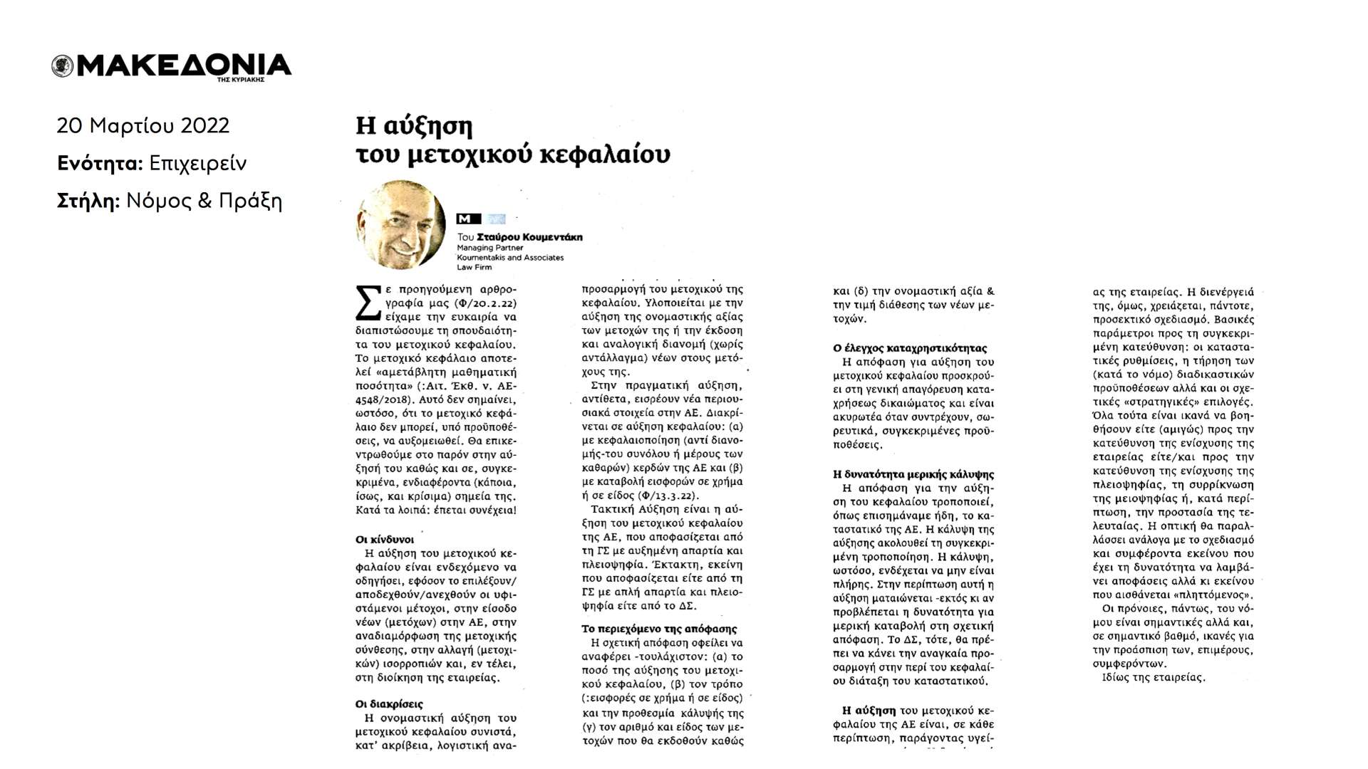 Σε προηγούμενη αρθρογραφία μας είχαμε την ευκαιρία να διαπιστώσουμε τη σπουδαιότητα του μετοχικού κεφαλαίου. Επίσης, τη διαφοροποίησή του από την εταιρική περιουσία της ΑΕ, που υπόκειται σε συνεχείς-αλλεπάλληλες μεταβολές. Το μετοχικό κεφάλαιο, αντίθετα, «…αποτελεί “αμετάβλητη” μαθηματική ποσότητα, που αναγράφεται στο καταστατικό της εταιρείας και το οποίο κατά την ίδρυσή της αντιστοιχεί στο άθροισμα της αξίας των εισφορών» (:Αιτ. Έκθ. ν. ΑΕ-4548/2018). Αυτό δεν σημαίνει, ωστόσο, ότι το μετοχικό κεφάλαιο δεν μπορεί, υπό προϋποθέσεις, να αυξομειωθεί. Θα επικεντρωθούμε στο παρόν στην αύξησή του καθώς και σε, συγκεκριμένα, ενδιαφέροντα (κάποια, ίσως, και κρίσιμα) σημεία της. Κατά τα λοιπά: έπεται συνέχεια!