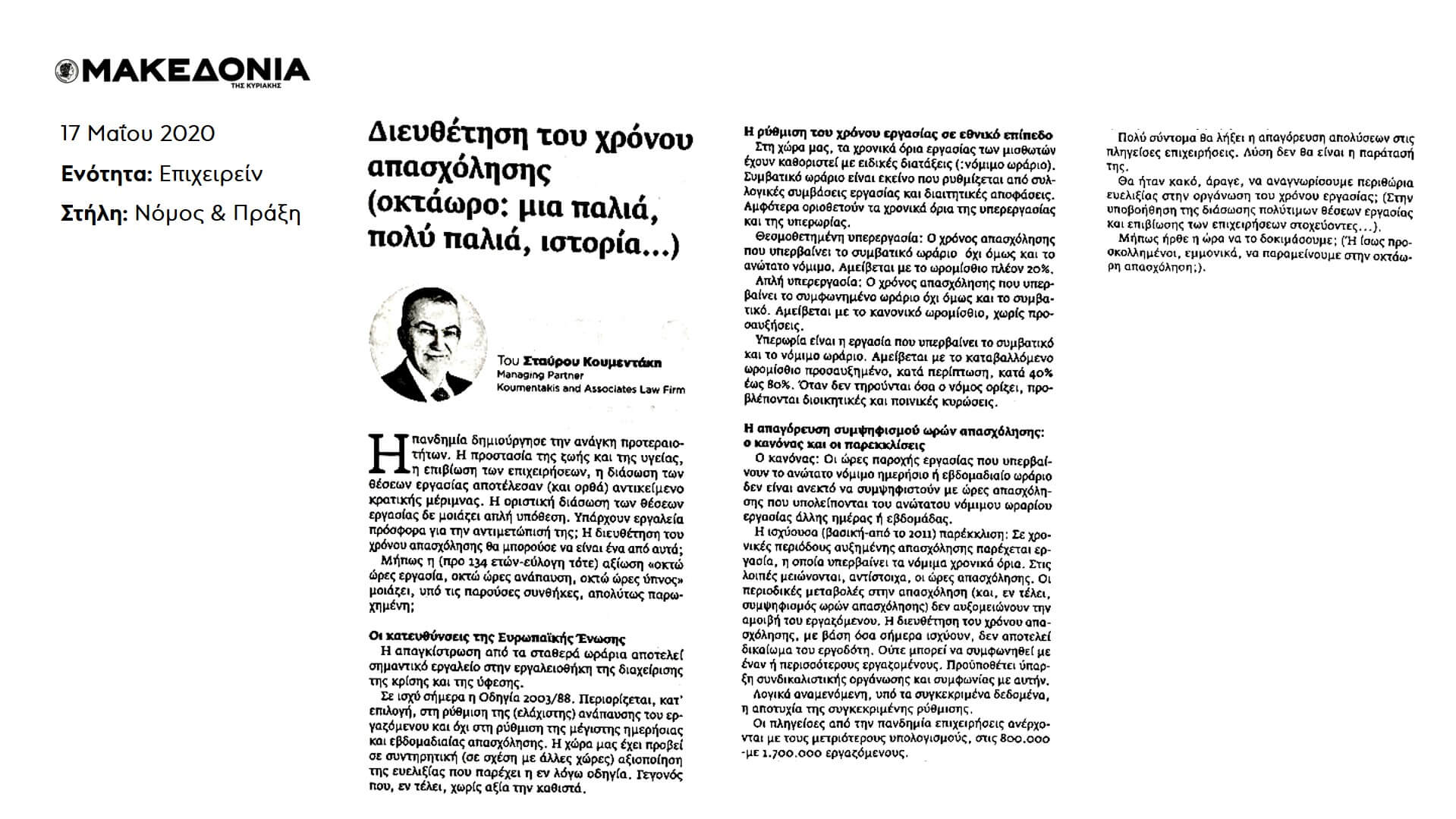 Η σε εξέλιξη, ακόμα, πανδημία δημιούργησε νέα σημαντικά δεδομένα-σε παγκόσμιο, μάλιστα, επίπεδο. Η προστασία της ζωής και της υγείας, η επιβίωση των επιχειρήσεων, η διάσωση των θέσεων εργασίας αποτέλεσαν (και ορθά) αντικείμενο κρατικής μέριμνας. Η «επόμενη» μέρα απαιτεί γενναιότερες αποφάσεις. Η διάσωση των εθνικών οικονομιών (και θέσεων εργασίας) δε μοιάζει απλή υπόθεση. Προφανώς η απαγόρευση των απολύσεων ή η υποχρεωτική απασχόληση δεν συνιστούν λύσεις. Η ανεργία αναμένεται να πλήξει βαρύτατα και τη χώρα μας. Υπάρχουν εργαλεία πρόσφορα για την αντιμετώπισή της; Η διευθέτηση του χρόνου απασχόλησης θα μπορούσε να είναι ένα από αυτά;
