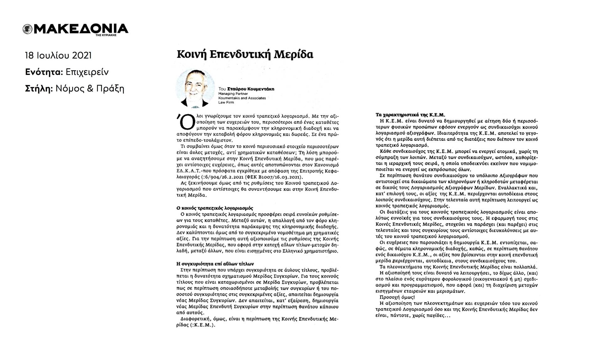 Όλοι γνωρίζουμε τον Κοινό, τραπεζικό, Λογαριασμό. Με την αξιοποίηση των ευχερειών του, περισσότεροι από ένας καταθέτες μπορούν να παρακάμψουν την κληρονομική διαδοχή και να αποφύγουν την καταβολή φόρου κληρονομιάς και δωρεάς. Σε ένα πρώτο επίπεδο-τουλάχιστον. Τι συμβαίνει όμως όταν το κοινό περιουσιακό στοιχείο περισσοτέρων είναι άυλες μετοχές, αντί χρηματικών καταθέσεων; Τη λύση μπορούμε να αναζητήσουμε στην Κοινή Επενδυτική Μερίδα, που μας παρέχει αντίστοιχες ευχέρειες, όπως αυτές αποτυπώνονται στον Κανονισμό ΕΛ.Κ.Α.Τ.-που πρόσφατα εγκρίθηκε με απόφαση της Επιτροπής Κεφαλαιαγοράς (:6/904/26.2.2021 (ΦΕΚ B1007/16.03.2021). Ας ξεκινήσουμε όμως από τις ρυθμίσεις του Κοινού τραπεζικού Λογαριασμού που αντίστοιχες θα συναντήσουμε και στην Κοινή Επενδυτική Μερίδα.