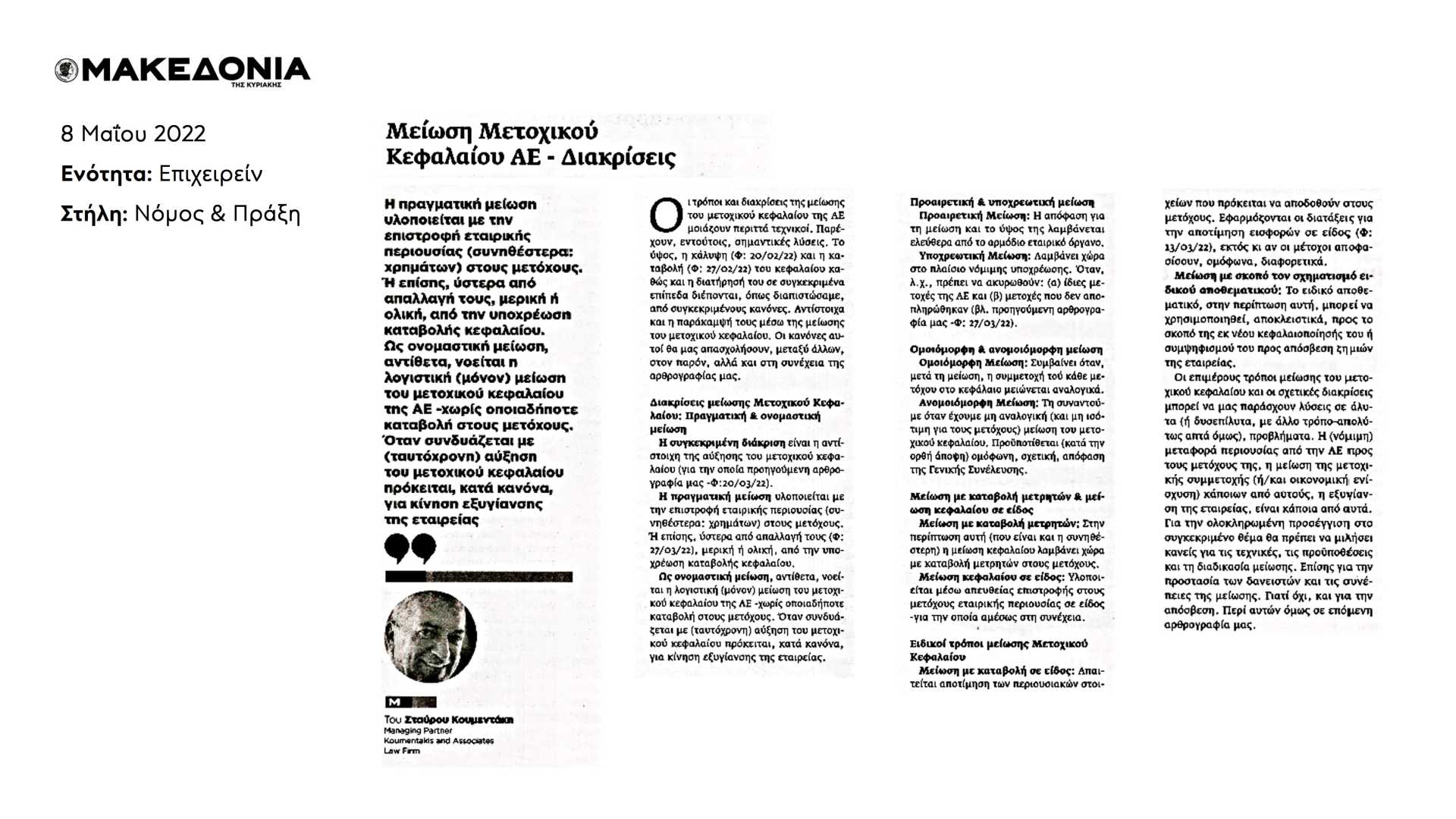 Οι διακρίσεις της μείωσης του μετοχικού κεφαλαίου της ΑΕ μοιάζουν περιττά τεχνικές. Επίσης και τα θέματα, ευρύτερα, που συναρτώνται με τη μείωση του μετοχικού κεφαλαίου. Είναι, εντούτοις-και στο σύνολό τους, σημαντικά καθώς δίνουν λύσεις σε άλυτα (ή, έστω, δυσεπίλυτα), με άλλους τρόπους, προβλήματα. Στην ιδιαίτερη σημασία του μετοχικού κεφαλαίου στην ύπαρξη και ανάπτυξη της ΑΕ έχουμε, επανειλημμένα, αναφερθεί στο πλαίσιο προηγούμενης αρθρογραφίας μας. Δεδομένης της σημασίας του, το ύψος, η κάλυψη και η καταβολή του καθώς και η διατήρησή του σε συγκεκριμένα επίπεδα διέπονται, όπως διαπιστώσαμε, από συγκεκριμένους κανόνες. Η παράκαμψή τους (μέσω της μείωσης του μετοχικού κεφαλαίου) δεν θα μπορούσε παρά να λάβει χώρα με συγκεκριμένους, αντίστοιχα αυστηρούς, κανόνες (άρθρα 29-31 ν. 4548/2018). Οι κανόνες αυτοί και, εν γένει, η έννοια της μείωσης μετοχικού κεφαλαίου, η διαδικασία και οι προϋποθέσεις της καθώς και οι έννομες συνέπειές της είναι κάποια από τα θέματα που θα μας απασχολήσουν στον παρόν, αλλά και στη συνέχεια της αρθρογραφίας μας.