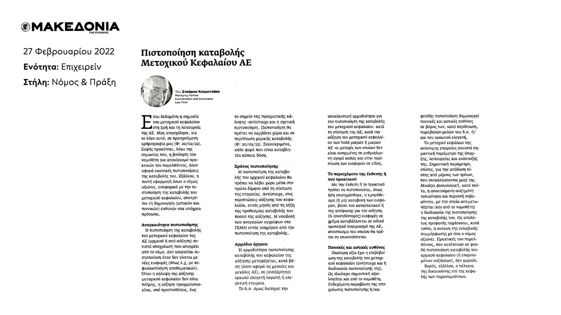 Είναι δεδομένη η σημασία του μετοχικού κεφαλαίου στη ζωή και τη λειτουργία της ΑΕ. Μας απασχόλησε, για το λόγο αυτό, σε προηγούμενη αρθρογραφία μας. Στο πλαίσιο αυτής αναφερθήκαμε, μεταξύ άλλων, στον σκοπό του μετοχικού κεφαλαίου, στην κάλυψη και την καταβολή του. Ειδικά, όμως, όσον αφορά την πραγματική (και εμπρόθεσμη) καταβολή του μετοχικού κεφαλαίου, καταλήξαμε πως «είναι εξαιρετικά σημαντική για την ΑΕ. Ακριβώς για το λόγο αυτό, η διαπίστωσή της λαμβάνει χώρα μέσω της (αυστηρά προδιοριζόμενης) διαδικασίας της πιστοποίησης..». Σαφής προκύπτει, εξ αυτής, η βούληση του νομοθέτη για αποκλεισμό πρακτικών του παρελθόντος, όσον αφορά εικονικές πιστοποιήσεις. Επιχειρούμε, με το παρόν, μια διεξοδικότερη αναφορά στα διαδικαστικά μεν εξαιρετικά σημαντικά όμως θέματα της πιστοποίησης της καταβολής του μετοχικού κεφαλαίου. Εξάλλου, η πιστή εφαρμογή όσων ο νόμος αξιώνει, αποτρέπει τη δημιουργία (αστικών και ποινικών) ευθυνών στα υπόχρεα πρόσωπα-μέλη του ΔΣ και ορκωτούς ελεγκτές.