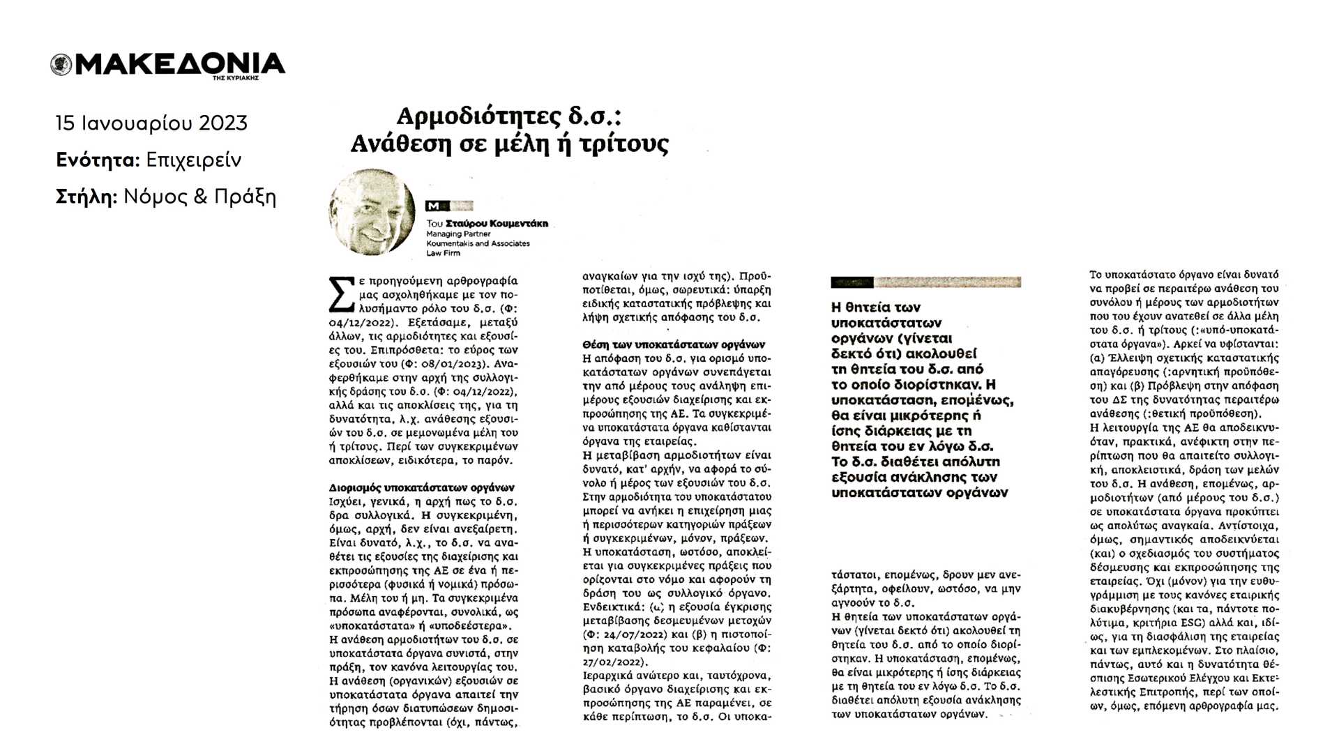 In our previous article we dealt with the important role of the Board of Directors. We examined, among other things, his powers and powers; additionally: the scope of his powers. We referred to the principle of the collective action of the Board (art. 77 §2 ed. 2 of law 4548/2018) but also to its deviations; for the possibility, e.g. of delegation of powers of the Board of Directors, to individual members or third parties. In the present article we will examine the specific deviations from the rule.