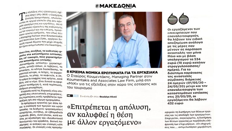 Ο Σταύρος Κουμεντάκης, Managing Partner στην Koumentakis and Associates Law Firm εξηγεί στην ΜΑΚΕΔΟΝΙΑ ΤΗΣ ΚΥΡΙΑΚΗΣ τις εξελίξεις στις εργασιακές σχέσεις, στον χώρο του Τουρισμού και της Εστίασης. Όπως αναφέρει προκύπτουν αρκετά ζητήματα που αγγίζουν δυσχερή νομικά θέματα.